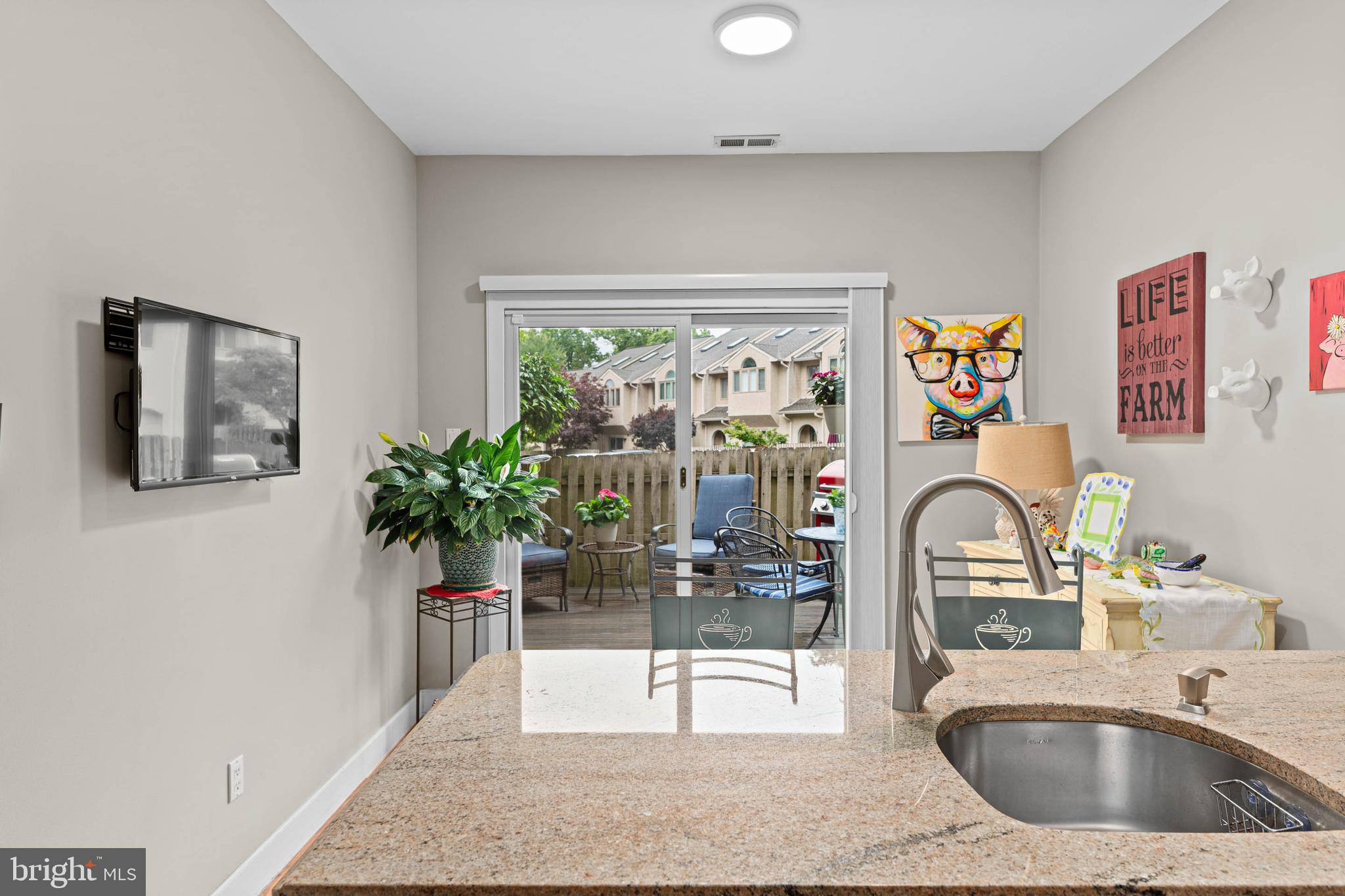 Upon entering the residence, you are greeted by an inviting foyer leading to a tastefully designed kitchen, complete with a breakfast nook, granite counters with breakfast bar, and new finger print resistant, black stainless steel appliances. The new glass sliding doors have access to an elegant, private front patio with maintenance-free decking. The open-floor plan offers a spacious dining room flowing seamlessly into the sunken living room, where a wood-burning fireplace stands as a centerpiece, offering warmth and ambiance. This area extends to a private rear patio and garden, perfect for relaxation and entertaining.