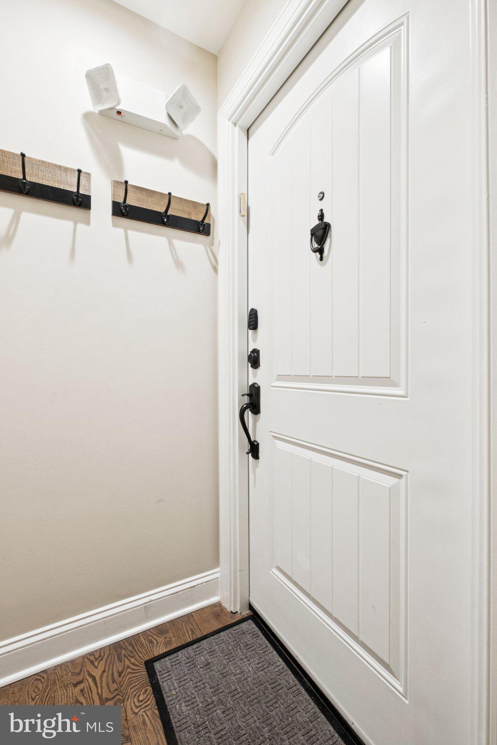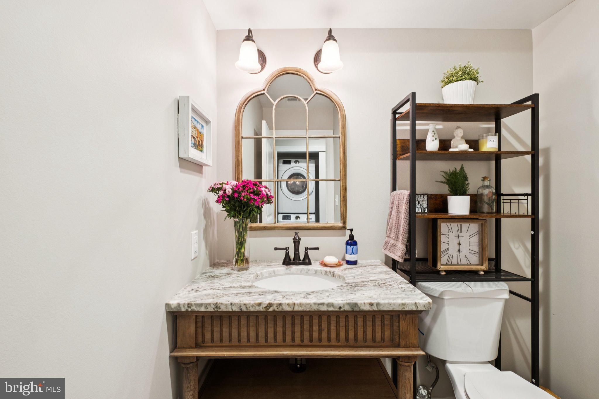 The main level features a bright, open-concept layout ideal for both everyday living and entertaining. The gorgeous eat-in kitchen serves as the heart of the home, showcasing beautiful granite countertops, ample cabinetry, a pantry, and modern finishes that feel both stylish and timeless. The living and dining areas flow seamlessly, filled with natural light and enhanced by a Juliet balcony. Down the hall, you'll find a coat closet, full-size washer and dryer, a convenient half bath, and a bedroom with a fitted closet--perfect for a guest suite or home office.